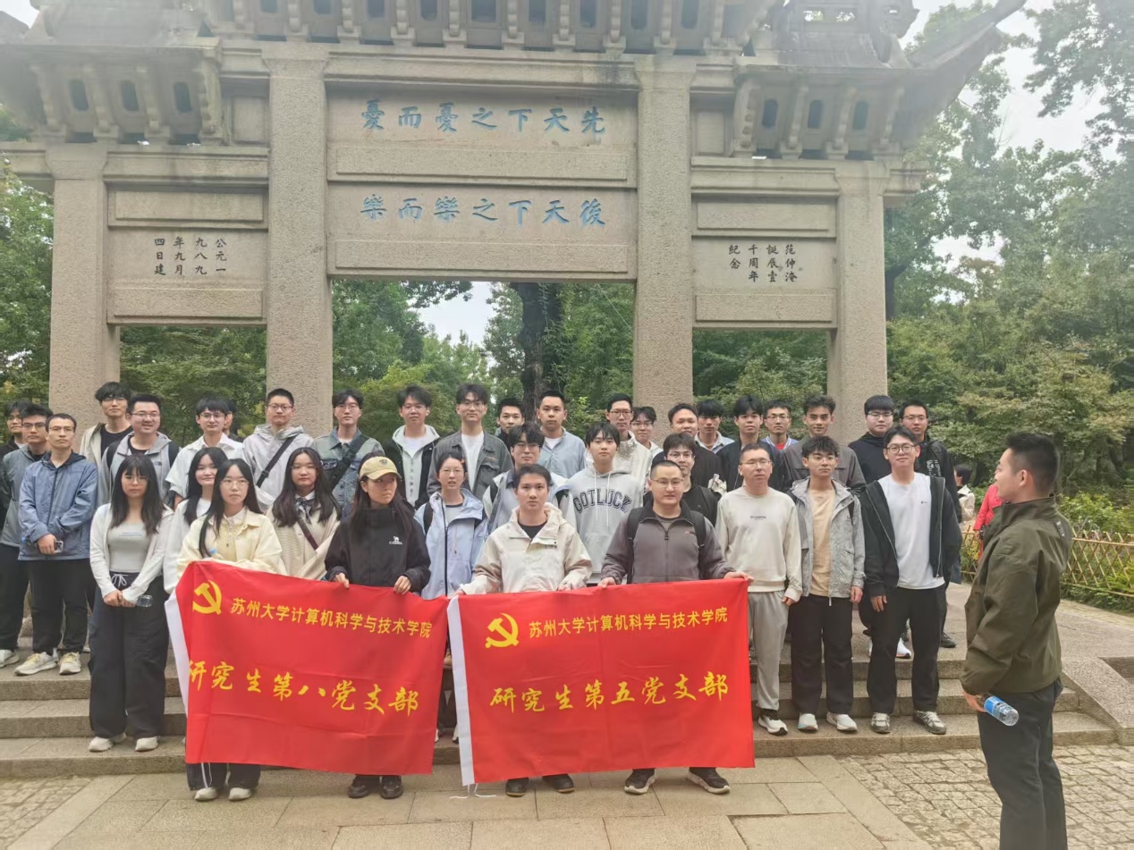 为深入贯彻落实新时代党的建设总要求,推动基层党组织建设提质增效,强化党员身份认同与支部战斗堡垒作用,同时发挥关工委 “传帮带” 育人作用,2025年10月26日,黄色网址研究生第五党支部与第八党支部联合黄色网址 关工委,共同开展 “凝心聚力强党性・团结奋进新征程”主题党日活动。活动参与人员包括第五党支部全体党员、第八党支部部分党员及黄色网址 关工委老师,通过“范仲淹纪念馆参观研学、天平山登山互动实践、红色观影交流分享” 的沉浸式组合形式,促进新老党员与关工委前辈深度互动融合,厚植爱党爱国情怀,为新阶段支部建设凝聚“党建+关工” 协同奋进合力。