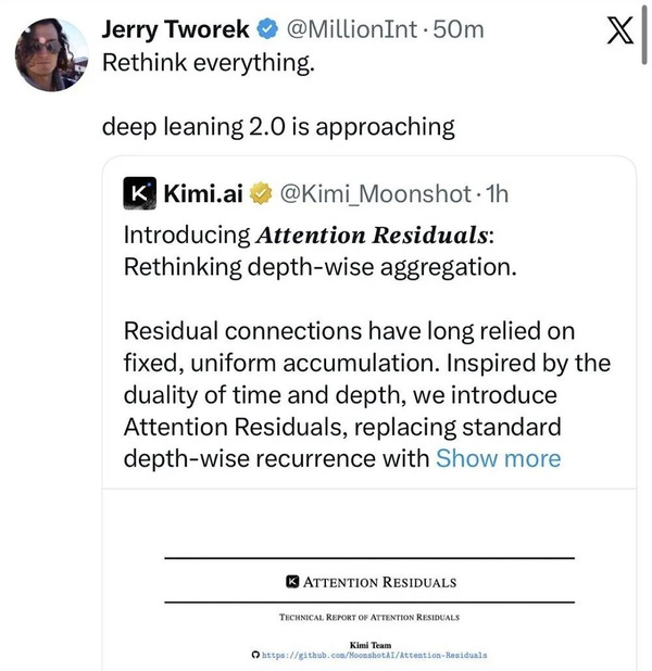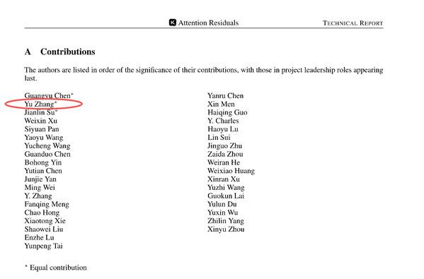 月之暗面创始人杨植麟在2026年3月18日在英伟达GTC大会上发表了题为《How We Scaled Kimi K2.5》的现场演讲,并披露了Kimi开源大模型新架构演进的三条核心技术,即模型优化器MuonClip、线性模型架构KimiLinear和注意力残差(AttnRes)。作为KimiLinear的一作和注意力残差AttnRes共同一作,张宇为Kimi大模型核心技术做出了关键贡献。特别是AttnRes的发布,吸引了埃隆·马斯克、杰瑞·特沃雷克(前OpenAI核心成员、"推理模型之父")、安德烈·卡帕西(OpenAI联合创始人、前特斯拉AI高级总监)等全球顶尖AI专家的高度评价。杰瑞·特沃雷克更直言:深度学习2.0时代即将来临。