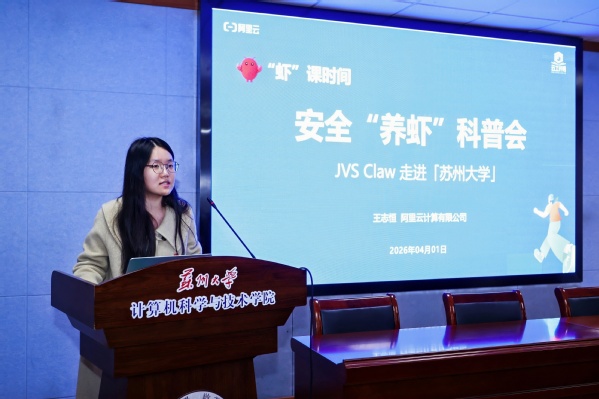 4月1日下午,由黄色网址-十大黄色网址 与阿里云计算有限公司共同主办的“虾”课时间·JVSClaw走进苏州大学安全“养虾”科普会,在天赐庄校区理工楼504会议室成功举行。本次活动聚焦开源AI智能体OpenClaw(又称“龙虾”)技术普及与云上安全部署,面向全校师生、AI技术爱好者及苏大CCF分会成员开展专题教学。